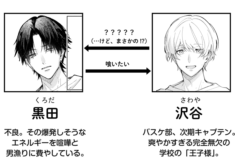 「学園の王子様を狙ってるのは、お姫様だけじゃねぇぞ」黒田は誰もが恐れる不良。その爆発しそうなエネルギーを喧嘩と男漁りに費やしている。そんな黒田が部活にだけは顔を出すのは、学園の王子様・沢谷がいるから。完全無欠の爽やか王子を、いつか「喰いたい」と狙う黒田は、部室で沢谷と二人きりの瞬間、ついに…!?