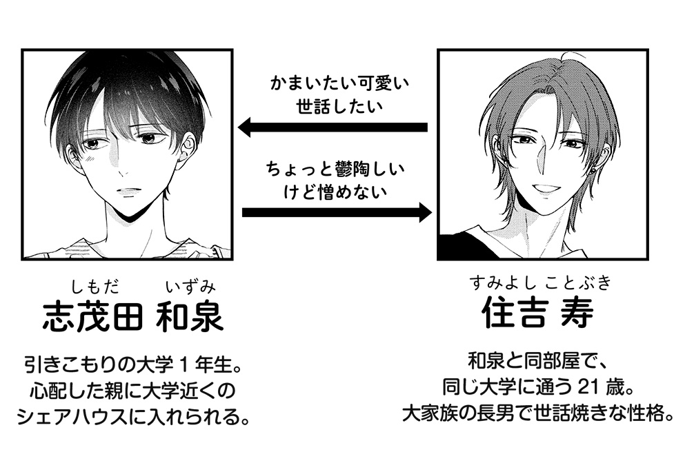 中学時代のイジメがきっかけで大学も不登校になった和泉は、親の計らいで大学近くのシェアハウスに入居することに。初めはクセの強い男たちとの共同生活に戸惑う和泉だったが、同部屋の寿に振り回されるうちに、だんだんとその温かさに惹かれていき…?