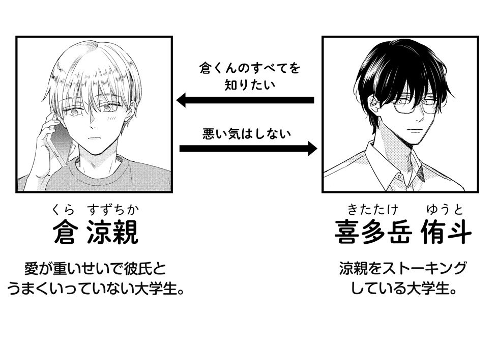 つい鬼電や鬼LINEをしてしまう涼親は、愛が重いせいで彼氏にうっとうしがられて、あまりうまくいっていない。そんな彼は最近、大学の同級生からストーキングされている。本当なら嫌なはずなのに、心が弱っている今は、自分を気にかけてくれる存在がうれしくて…?